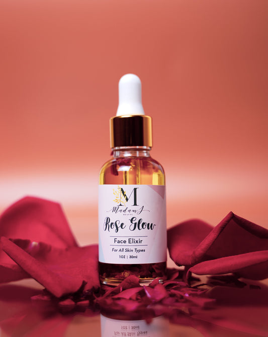 Our Rose Glow Face Elixir is packed with skin loving ingredients such as Marula Oil & Rosehip Oil to contribute to an even skin tone, solidify all day moisture, and fade dark marks.